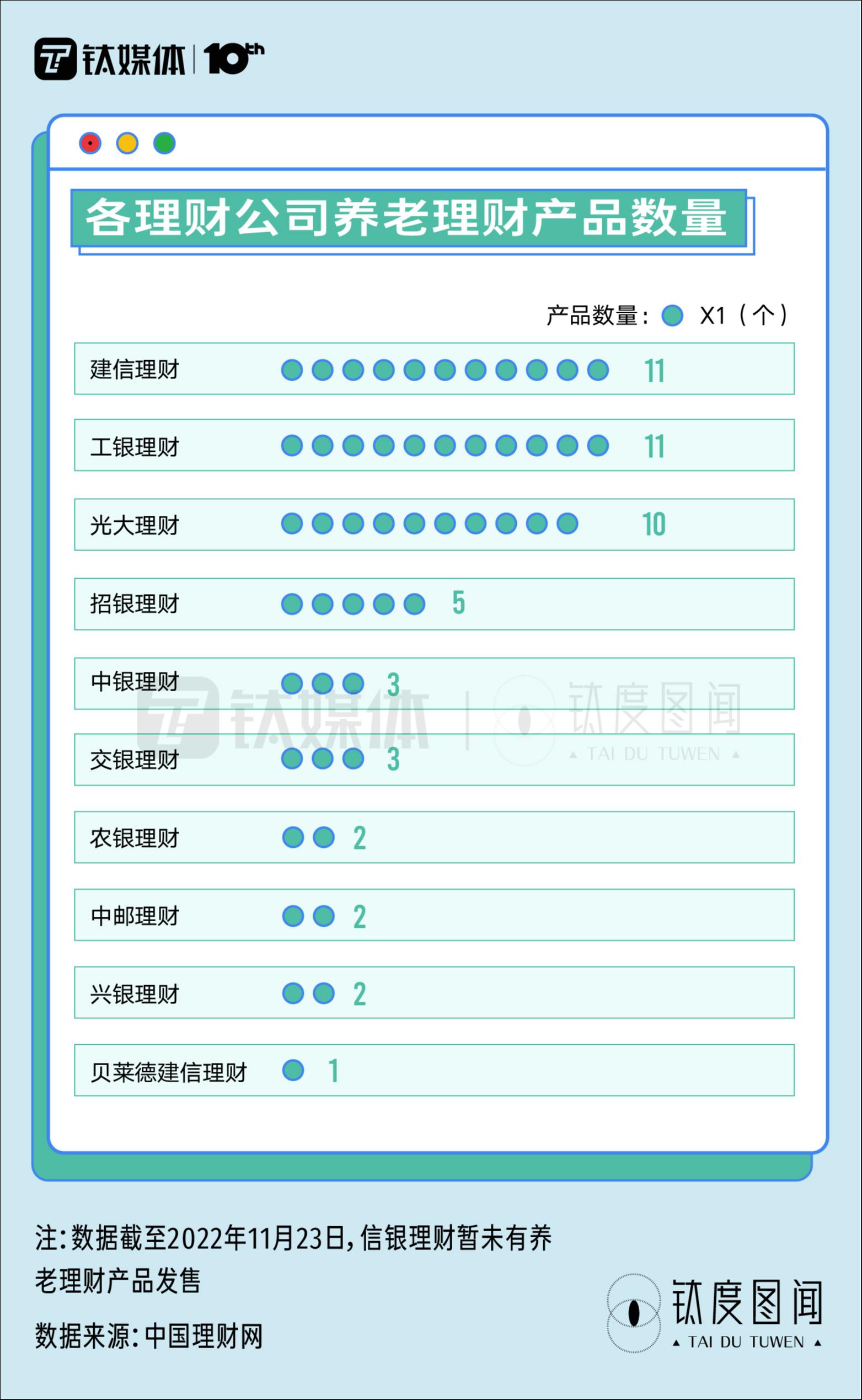 11月18日,首批开办个人养老金业务机构的名单出炉,11家理财公司拿到“入场券”,正在积极备战个人养老金业务。据钛媒体·钛度图闻统计,从已发售的养老理财产品来看,截至11月23日,除信银理财暂未有养老理财产品发售外,其余10家理财公司累计发行了50只养老理财产品,规模已经超过973亿元,成为最大的第三支柱养老金融产品。