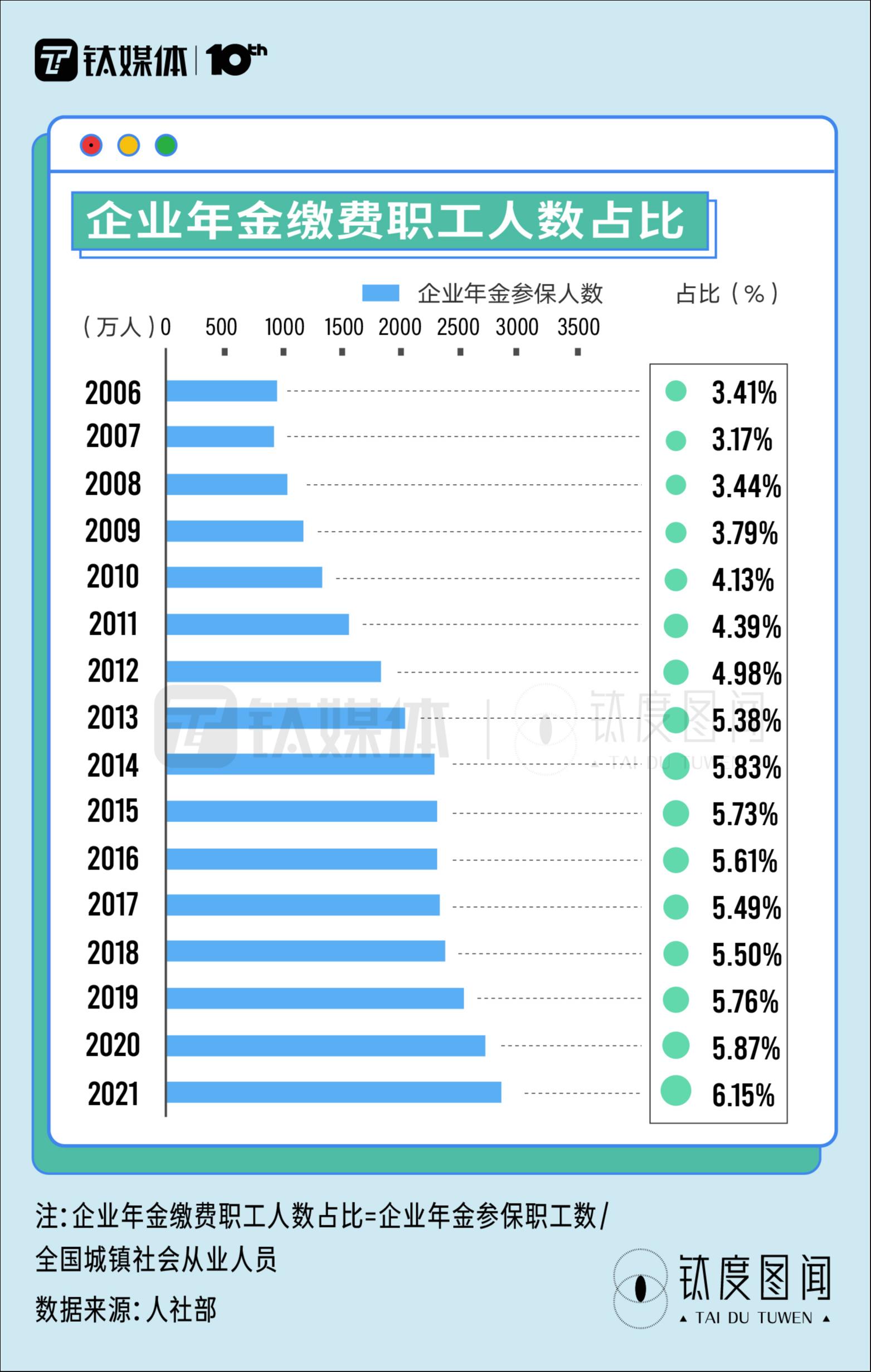 其中,在企业年金方面,目前企业年金覆盖人口仅2000余万人,占全国城镇社会从业人员数量的6.15%,覆盖面窄。此外,设立企业年金的准入门槛也较高。截至2021年末,全国共有11.75万户企业建立企业年金,累计结存为2.61万亿元。