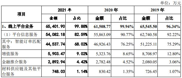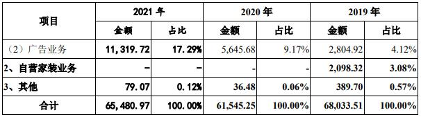 从收入来源看,2021年,土巴兔线上平台业务收入占比高达99.88%,包括智能订单匹配服务、增值服务、金融推介服务和广告业务。其中智能订单匹配服务也就是信息中介服务是其核心收入来源,在2021年实现业务收入4.45亿元,占总收入的68.02%。