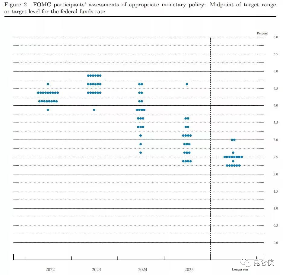 本次议息会议发布的利率点阵图如下所示,横轴代表了时间,纵轴代表了利率水平。因为一共有19位委员,所以图上每年都有19个点,每个点都代表了一名委员对当年利率的预测。而所谓的利率中值就是取这19个委员预测值的中位数。