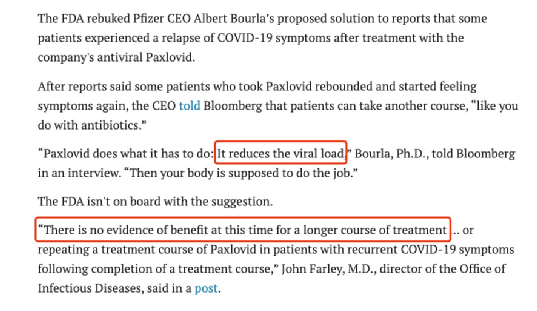 你可能会问,复阳之后再吃一个疗程的Paxlovid不就解决问题了吗?今年5月辉瑞公司的首席执行官 Albert Bourla 也提出了类似的解决方案,但随后遭到了FDA 的驳斥。他们认为,“Paxlovid减少了病毒载量,但目前没有证据表明较长疗程的疗程有益”。
