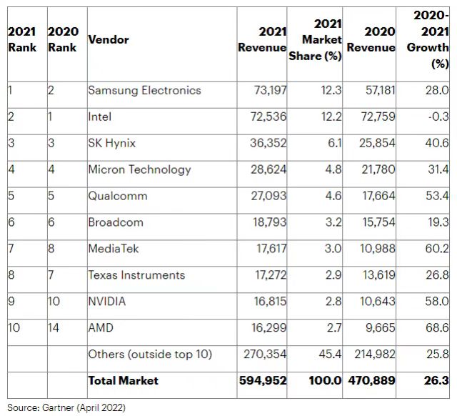 回顾半导体产业的发展脉络,PC的出现带动了半导体行业第一批巨头的崛起,到2010年以后,全球半导体行业从PC时代进入智能手机时代,重新开启了新一轮快速成长期。但当前半导体行业的格局其实从PC时代就基本稳定,根据Gartner公布的2021年十大半导体企业榜单,我们看到,榜单上还是英特尔、美光科技、AMD、英伟达等熟悉的“面孔”。