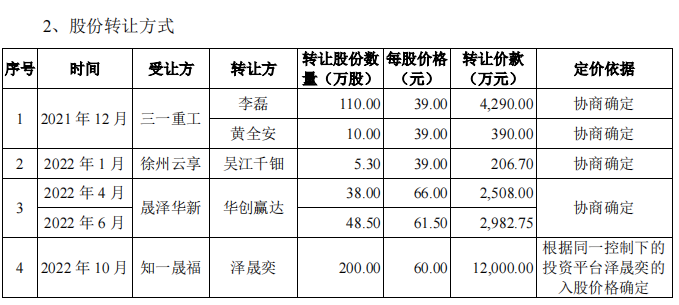 2021年12月,三一重工耗资4680万元,分别受让了李磊持有的110万股、黄全安持有的10万股,成为绿控传动的新股东。值得一提的是,三一重工的控股股东三一集团自2020年起就进入公司前五大客户之列。此次交易作价39元/股,李磊通过此次股权转让套现4290万元。此后至2022年10月,绿控传动还进行过多次股权转让和增资,先后引进了包括知一晟福、道禾前沿、建湖宏创在内的12名股东。在前述“突击”入股完成后,2022年12月30日,绿控传动科创板申请获受理。值得注意的是,多轮投资入股之后,绿控传动的估值也水涨船高。