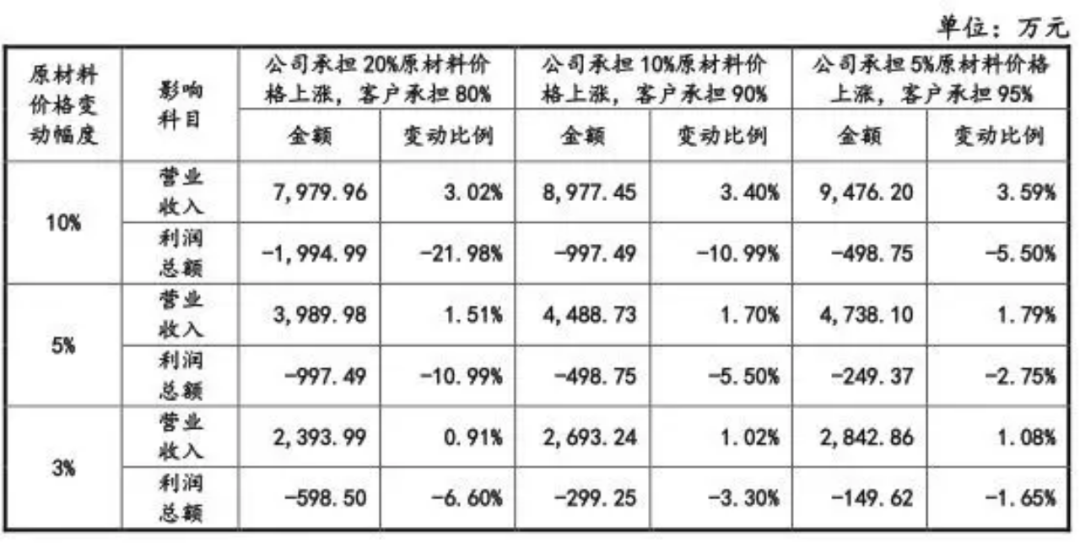 以2021年的营业收入、营业成本和原材料采购价格为基数推算可得,在销量等其他外部条件保持不变时,主要原材料价格波动5%,那么其利润总额在承担20%、10%、5%价格波动时,分别会下降11%、5.5%、2.75%。