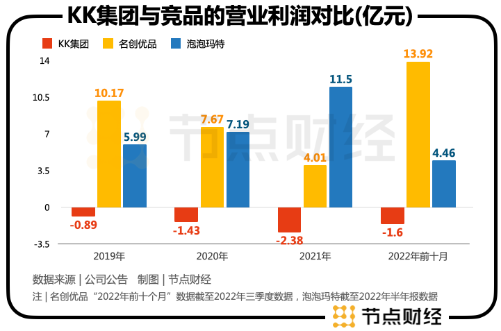 具体为2019年-2021年及2022年前十个月,KK集团营业利润分别为-0.89亿元、-1.43亿元、-2.38亿元及-1.6亿元。