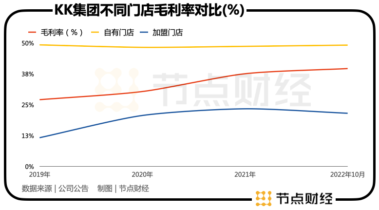 首先,在扩门店方面,KK集团重点提到了增加“自有门店”。数据显示,公司自有门店的销售毛利率几乎是加盟门店的两倍多,自有门店占比的增加自然会增厚公司的毛利润。
