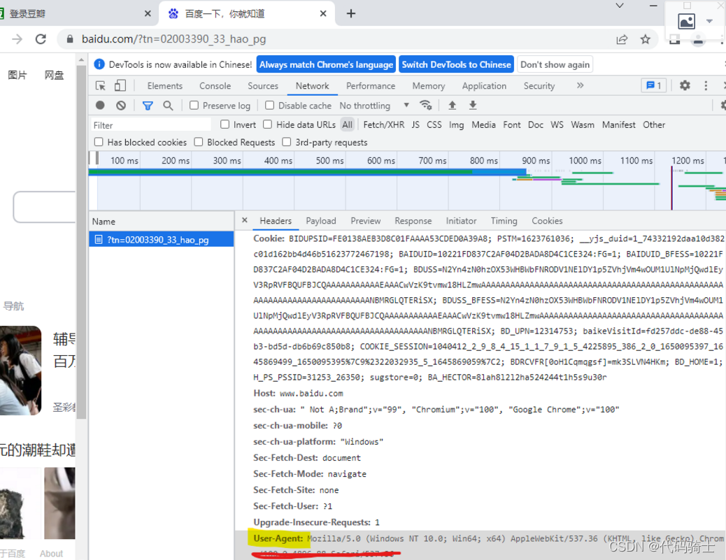 网络工作记录,按下图顺序点击,会得到很多响应信息。比如:请求头(Header)信息、Cookie、User-Agent等等,作用下面说。