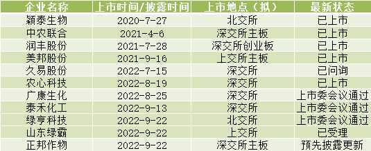 2022年8月19日,农心科技成功登陆深圳交易所;8月25日,广康生化创业板IPO申请过会;30日-31日两天时间,久易股份和泰禾化工接续成功闯关创业板;9月3日-4日接连两天,正邦作物和山东绿霸分别冲刺深交所和上交所主板IPO;9月25日,绿亨科技冲击北交所IPO成功。