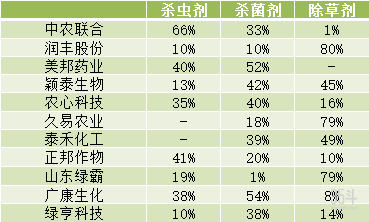 每一家农药企业都有属于自己的核心业务。将杀虫剂作为核心业务的是中农联合、正邦作物2家企业;将杀菌剂作为核心业务的是美邦药业、农心科技、广康生化和绿亨科技4家企业;将除草剂作为核心业务的是润丰股份、久易农业、泰禾化工、山东绿霸4家企业。其中,颖泰生物的核心业务是杀菌剂和除草剂。