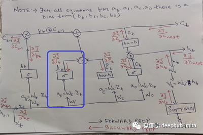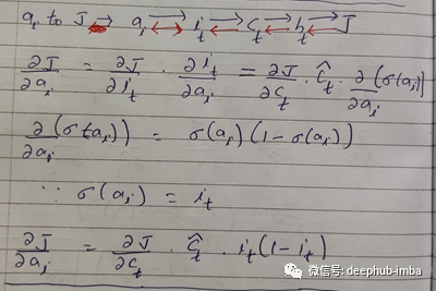dJ/dh_t * dh_t/dC_t * dC_t/di_t可以写成dJ/di_t(我们在上面有这个值)。所以我们只需要对i_t w.r求导。t ai。