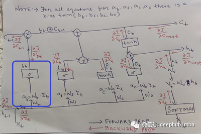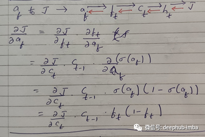 dJ/dh_t * dh_t/dC_t * dC_t/df_t可以写成dJ/df_t(我们在上面有这个值)。所以我们只需要对f_tw.r求导。t a_f。