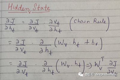 隐藏状态是h_t。h_t是w.r的微分。根据链式法则,推导过程如下图所示。
