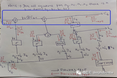 所以如果我们在这里观察,J和h_t是单元格的最后一步,如果我们计算dJ/dh_t,那么它可以用于像dJ/dC_t这样的计算,因为: