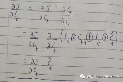 可以将dJ/dh_t * dh_t/dC_t写入为dJ/dC_t(我们在单元格状态中有这个值)。所以我们只需要对C_t w.r求导。t i_t。