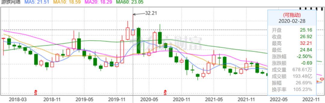 不断下滑的业绩直接影响了游族网络的股价,股价由2020年2月28日的32.21元/股的高位,一路下跌,即便近期股价有所回升,来到2023年1月4日的10.16元/股,也跌去了68.5%。
