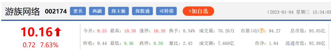 该公告一出,游族网络股价大涨,盘中一度上涨9.96%,截至4日收盘,最新股价为10.16元/股,涨幅为7.63%。自2022年10月25日的7.56元/股以来,游族网络股价持续上扬,至今,涨幅约为35%。