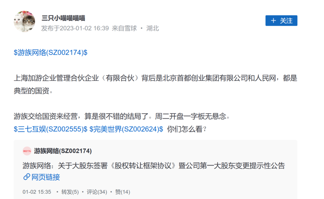在雪球投资者平台,有用户曝料称,上海加游企业管理合伙企业(股份合伙)的背后是北京首都创业集团有限公司和人民网,都是典型的国资,并称游族网络交由国资管理是不错的结局。而上海加游企业管理正是林奇三个未成年子女拟转让股权的受让方。