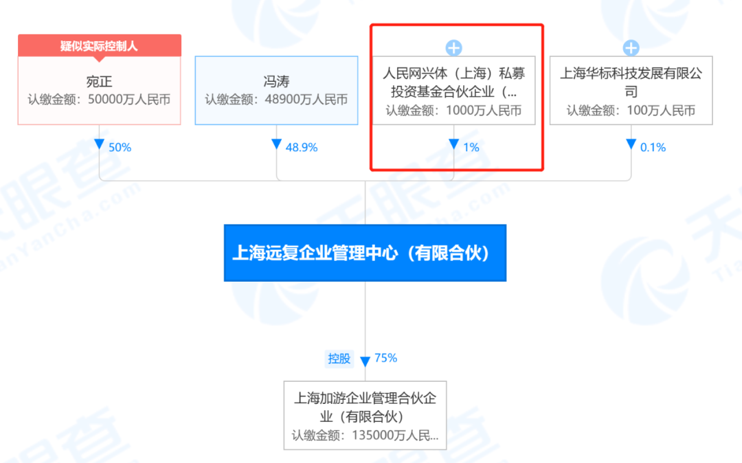 BT财经通过天眼查股权穿透图,发现本次收购游族网络1.13亿股权的上海加游企业管理合伙企业(股份合伙)的第一大股东为上海远复企业管理中心,其持有上海加游75%的股份,是当仁不让的大股东,再通过天眼查股权穿透,可以发现人民网是上海复远企业管理中心持股方,虽然人民网只投资了1000万元,持有上海复远企业管理中心1%的股权,但网上传言亦有事实根据。