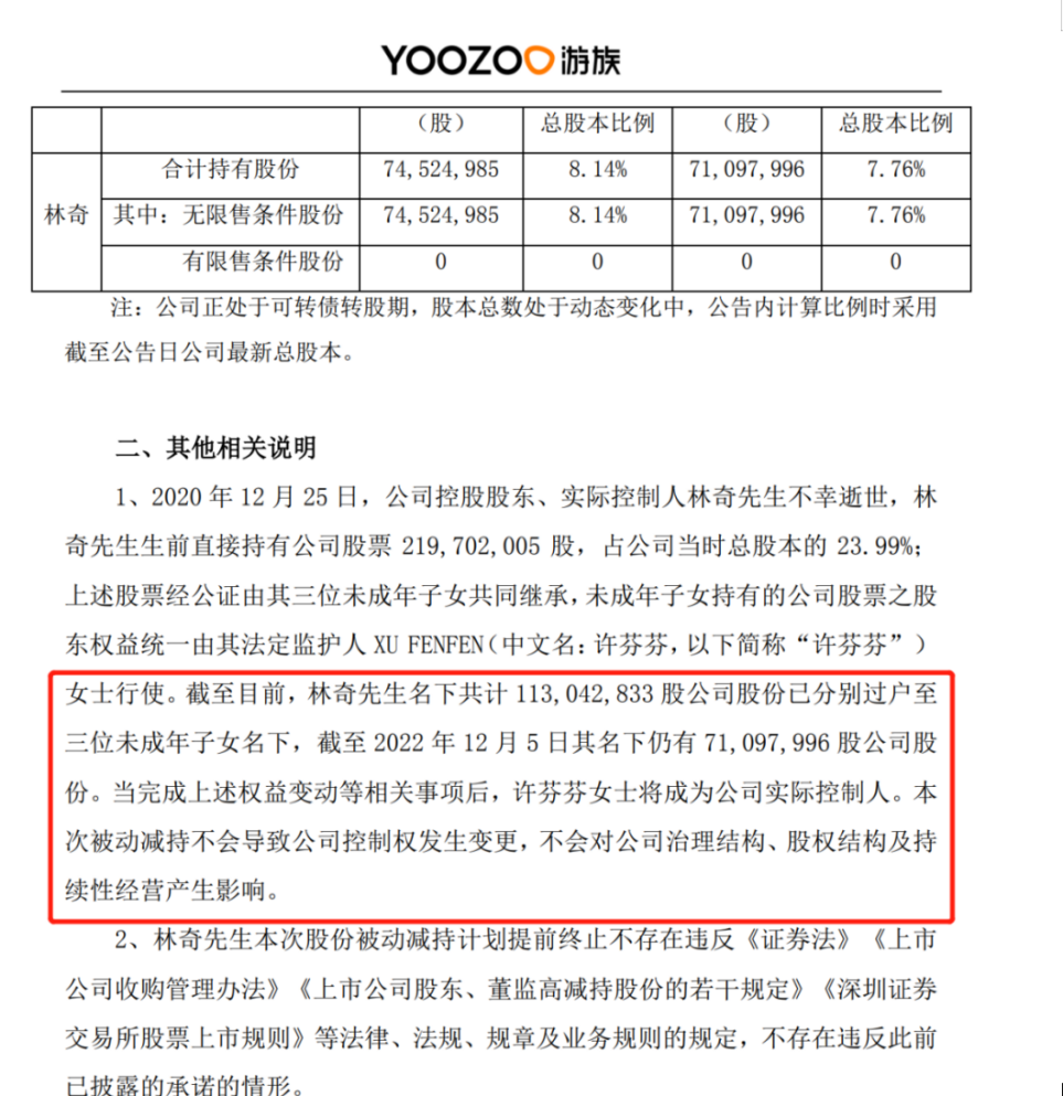 截至2022年12月8日,林漓、林芮璟及林小溪三位继承人合计累计被冻结数量约为1.13亿股股份从冻结时间来看,也就是说林奇三个未成年子女刚过户完股份就被冻结。
