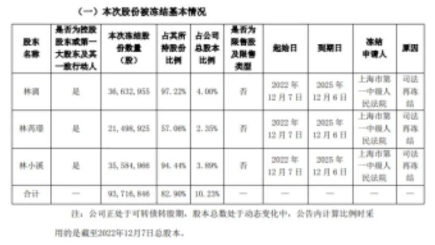 林奇生前遗留的2.2亿股份中,部分股份存在被司法再冻结的情况,合计冻结股份数量约9371.7万股,占其所持股份比例为82.9%,占公司总股本比例为10.23%。起始日为2022年12月7日,到期日为2025年12月6日。