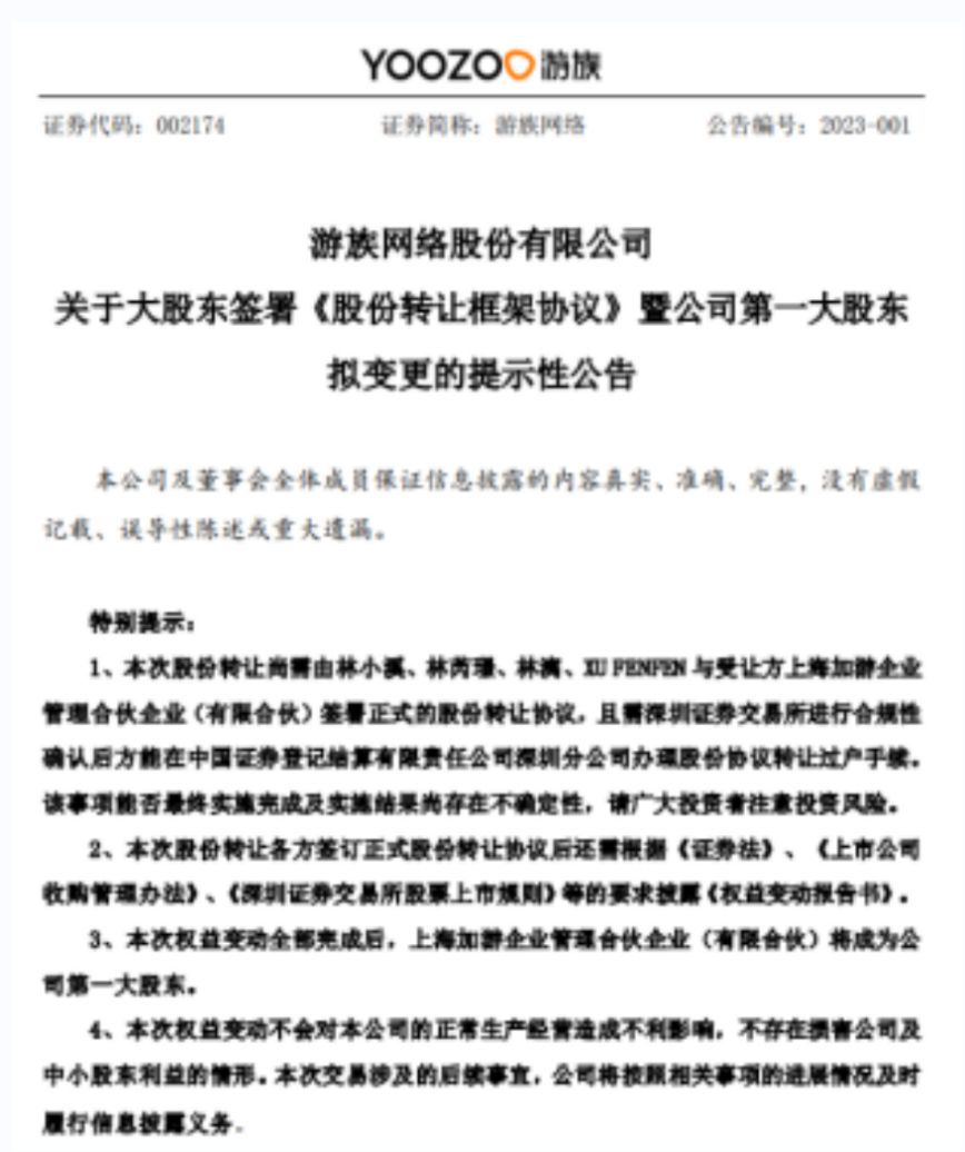 2023年1月4日,游族网络发布公告称,公司原控股股东、实际控制人林奇的继承人林小溪、林芮璟、林漓及其法定监护人XU FENFEN(中文名:许芬芬)拟转让持有的游族网络1.13亿股股份,受让方为上海加游,上海加游成为游族网络第一大股东。