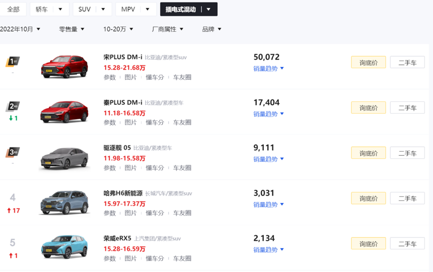 当前,在主力价格区间里,插混车由比亚迪一家独大。特别是在10-20万的价格带内,除了比亚迪之外,其他产品难以形成实质上的产品力竞争。