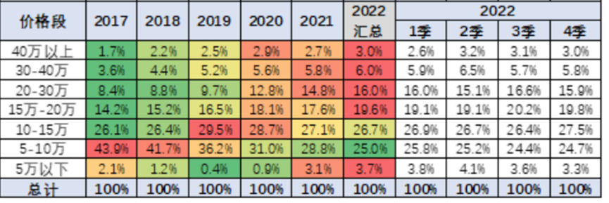 如今,新能源汽车行业即将迈入第三个阶段。在上个阶段中,由于智能化的内卷导致汽车售价较高,产品受众天花板较低。而当前我国汽车市场消费的主要价格区间在5-20万元内,5-10万占比25.0%,10-15万占比25.7%,15-20万占比19.6%(2022年数据)。