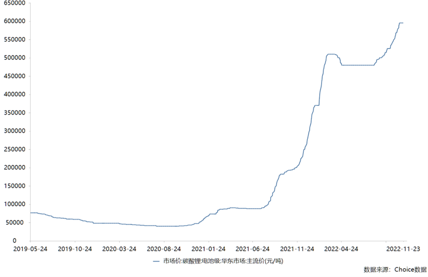 由于新能源汽车在全球的快速放量,使得锂元素已经成为了石油一般的硬通货。原材料碳酸锂从2019年的不到5万一吨,一路飙升至近60万。在各大机构对锂电池价格的预测中,均显示未来相当长时间内成本难以下降的趋势。