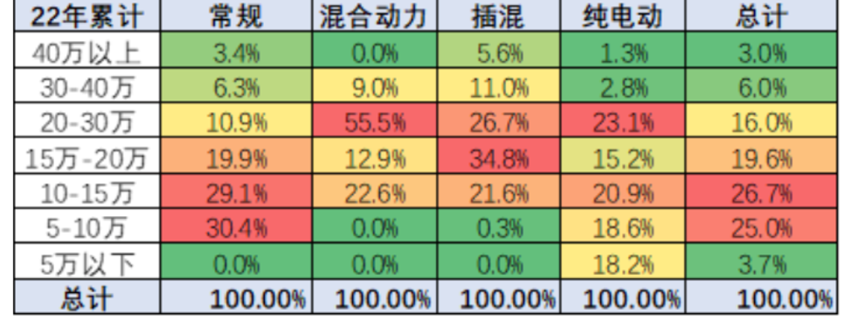 受堆料影响,这些车型的价格主要集结在30万及以上的价格区间,属于豪华车的范畴,销量占总新能源销量的占比很低(插混16.6%、纯电4.1%)。