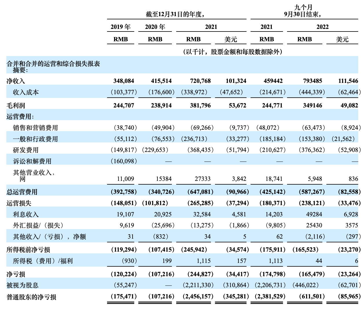 虽然拿了多轮融资,但由于大肆扩张和投入,禾赛目前的业务营收情况并不理想。招股书显示,禾赛 2019 年-2021 年间净亏损达到 1.2 亿元、1.07 亿元、2.45 亿元,2022 年前九个月净亏损为 1.65 亿元。