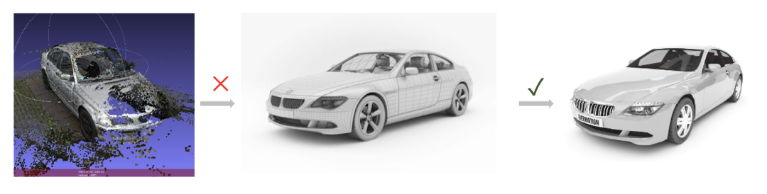 但这种方法同样因为噪声、点云稀疏问题无法形成完整的几何结构,需要更多的人工加工,才能真正为图形学使用。而一个完美的图像渲染过程需要一个完美的多几何结构和材质,所以这种方式很难达到渲染需要的质量。