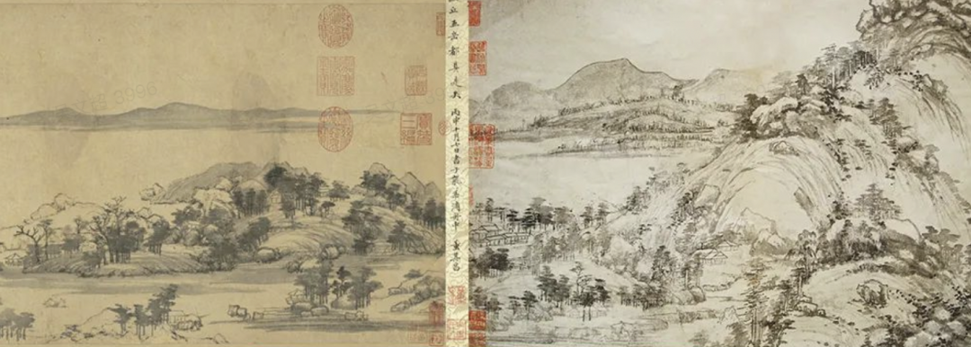 ▲ 浙江博物馆馆藏《富春山居图·剩山图》局部(左),台北故宫博物院馆藏《富春山居图·无用师卷》局部(右)