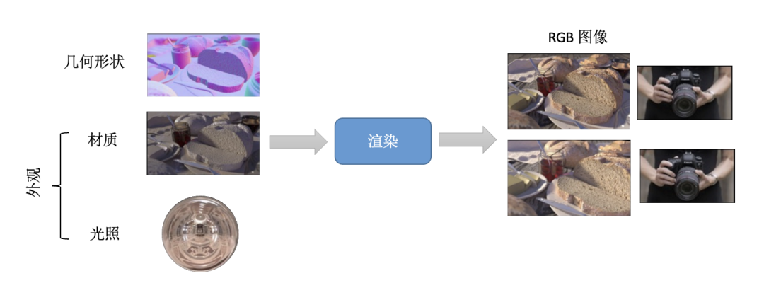 除了几何形状,完整的3D内容还包含材质(贴皮),再结合光照,最终通过渲染形成多角度的RGB图片。