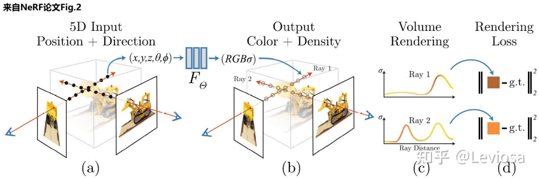 NeRF将场景表示为空间中任何点的volume density σ(简单理解为不透明度) 和颜色值c 。有了以NeRF形式存在的场景表示后,就可以对该场景进行渲染,生成新视角的模拟图片。NeRF的输入为空间点的位置和方向,通过求解穿过场景的任何光线的颜色,从而渲染合成新的图像。
