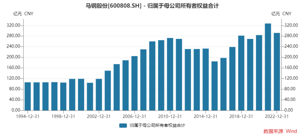 1994年马钢股份上市时的归属于母公司所有者权益为106亿,截至2022年达到了292亿,增加了186亿,可如果考虑到中间增发的55亿转债,实际净资产大约增加了131亿左右。30年时间,沧海桑田,仅仅翻倍而已。