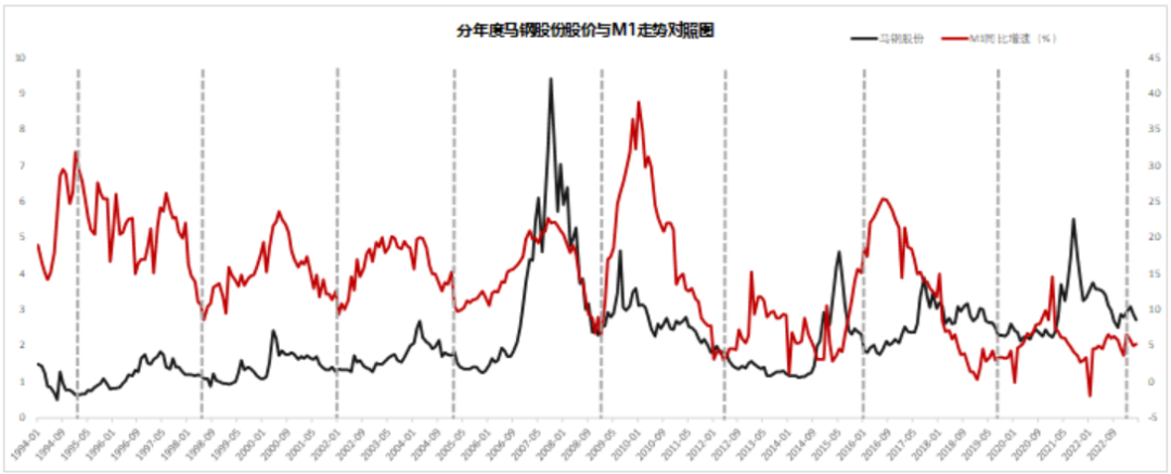上图是马钢股份股价与M1同比增速走势对照图。在2010年之前,M1直接带动的是基建,是钢铁煤炭有色为代表的大众商品周期,所以M1的走势跟马钢股份的股价基本一致。
