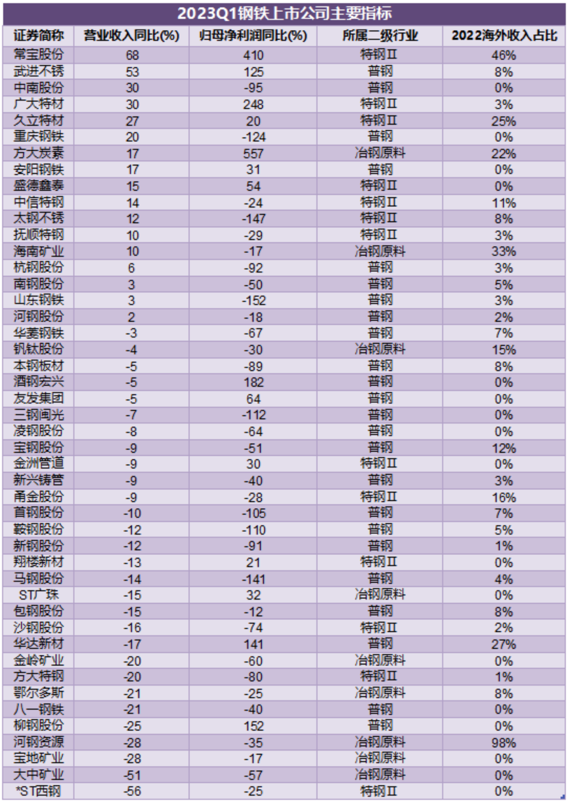2023年1季度虽然钢铁行业整体收入和净利润同比增速都是负数,但依然有6家上市公司收入同比增速在20%以上,即常宝股份、武进不锈、中南股份、广大特材、久立特材、重庆钢铁。除了重庆钢铁属于区域钢铁集团之外,都是全成本型特钢企业。收入同比增速最低的几家上市公司包括*ST西钢、大中矿业、宝地矿业、河钢资源、柳钢股份、八一钢铁,显然铁矿石上市公司在其中比较显眼。