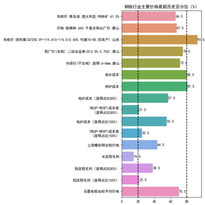 钢铁行业目前整体的利润并不在下游的冶炼环节,而在上游的铁矿石和焦炭。虽然政策已经在很努力的压铁矿石价格了,但目前铁矿石价格依然处于历史百分位中的60%以上,焦炭价格处于在历史百分位的将近80%。盈利端,钢铁行业的最普遍的长流程毛利,只处于历史的15%分位。