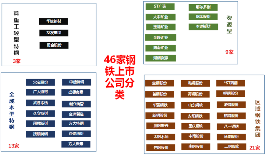 分类是研究的基础。A股申万钢铁总共46家上市公司,我们可以将这些上市公司分成4类,即资源型、区域钢铁集团、全成本型特钢和料重工轻型特钢。