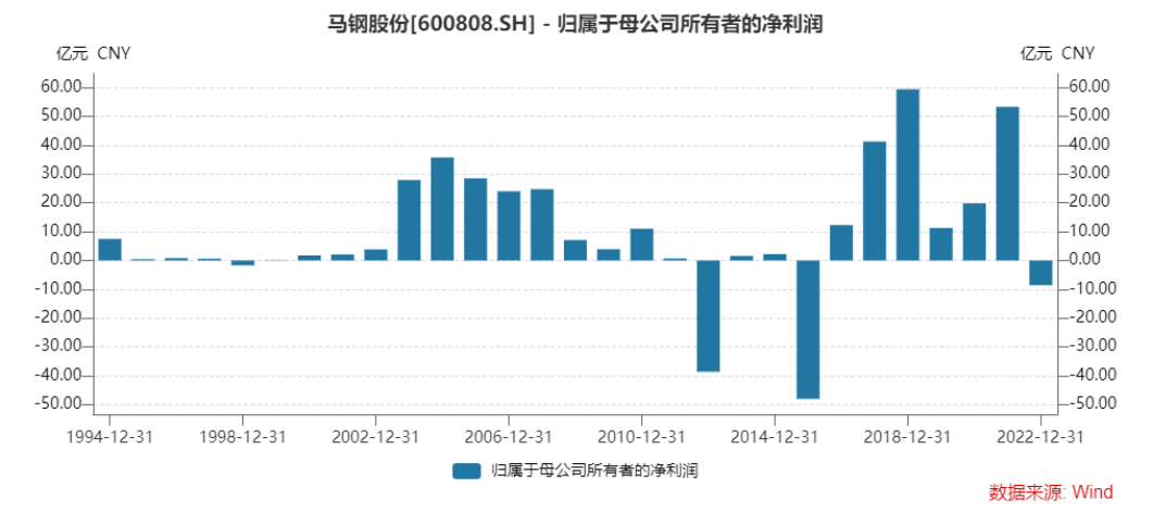 周期股低估值是对盈利水平大幅波动的一种风险补偿。 马钢股份从1994年以来的盈利,波动非常大。2003-2007的这5年,马钢股份每年的归母净利率都在20亿以上,这也是中国大宗商品需求大爆发的5年,供需两旺。