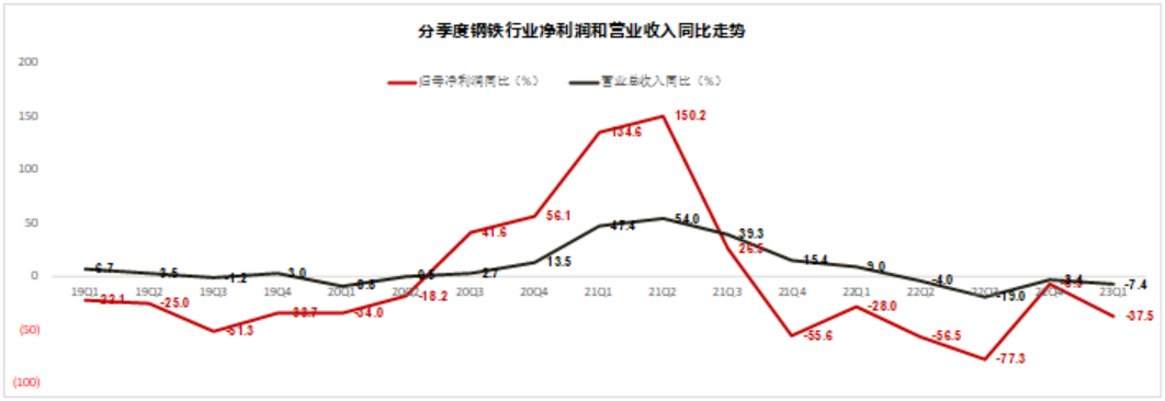 分季度看,钢铁上市公司当前仍处于盈利的底部。从2019年以来,钢铁上市盈利同比的高点出现在2021年的2季度,2023年1季度全部钢铁股上市公司营业收入同比增速的中位数是-7.4%,归母净利润同比增速的中位数是-37.5%。实际从2021年4季度开始,钢铁行业整体的归母净利润同比增速就进入负数区间,2023年1季度更是在22年同比下滑28.0%的基础上又出现了大幅负增长。
