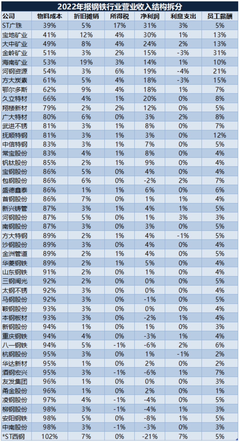 根据上市公司2022年报,我们将46家钢铁上市公司的营业收入拆成了物料成本、折旧摊销、所得税、净利润、利息支出和员工薪酬六部分,得出了上面这张表。