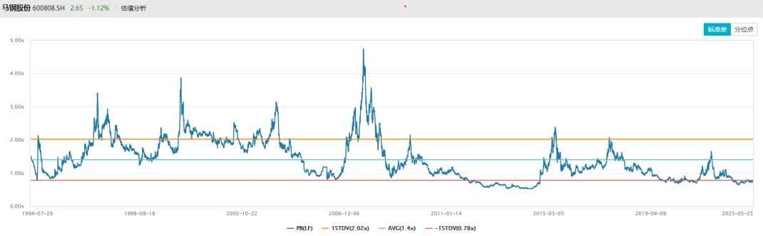 过去30年,马钢股份的市净率平均数是1.4倍左右,向上1倍标准差2.02倍,向下1倍标准差0.78倍。在2010年之前,马钢股份大部分时间的市净率都在平均数1.4倍以上,而进入2010年之后,钢铁的周期性表现的更明显,大部分时间的估值实际上处在向下一倍标准差,也就是0.78上下,只有当牛市,或者周期高点的时候,才能碰到平均数,向上1倍标准差,也就是2倍市净率的时间极少。