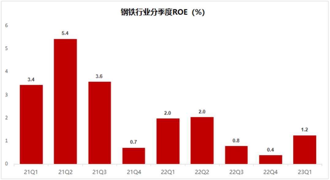 钢铁行业的盈利情况波动很大,对应的ROE波动也很大。从中位数角度的分季度行业ROE来看,2023年1季度钢铁行业的ROE为1.2%,环比2022年4季度提升了0.8个百分点。但从同比角度看,23年1季度钢铁行业ROE水平要比22年同期低0.8个百分点,应该说这是一个比较差的结果。