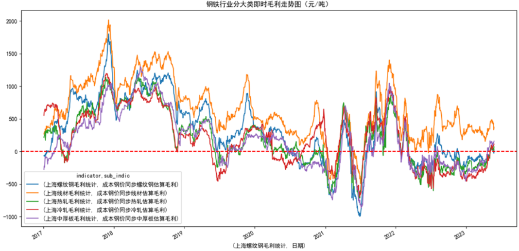 从历史规律上看,钢铁行业的股价走势跟行业盈利状况是紧密相关的。根据长江证券研究所有色团队的数据,进入2022年之后,钢铁行业就已经进入全行业亏损阶段,最近两周有一个变化就是因为上游铁矿石和焦炭的价格下滑,钢铁行业开始盈利了。