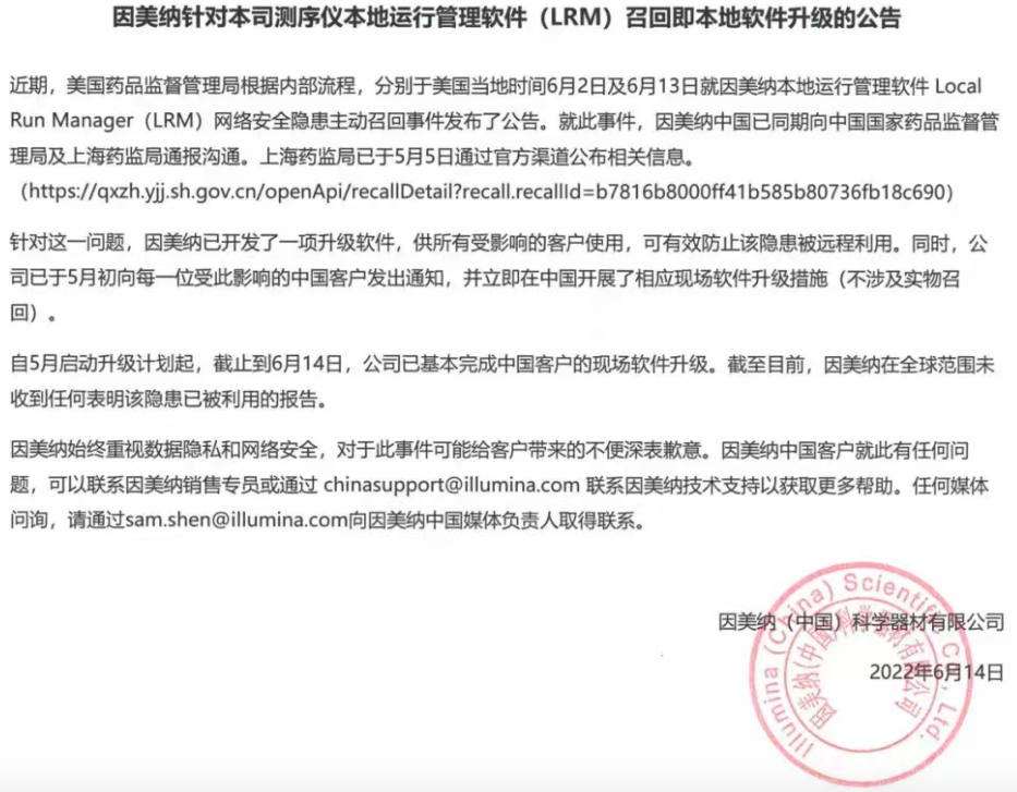 另外,因美纳第一时间在全球范围内启动了不涉及实物的“召回”措施。在中国市场,因美纳5****月初报备上海食品药品监督管理局,并向每一位受此影响的中国客户发出通知,立即在中国开展了相应的现场软件升级措施。