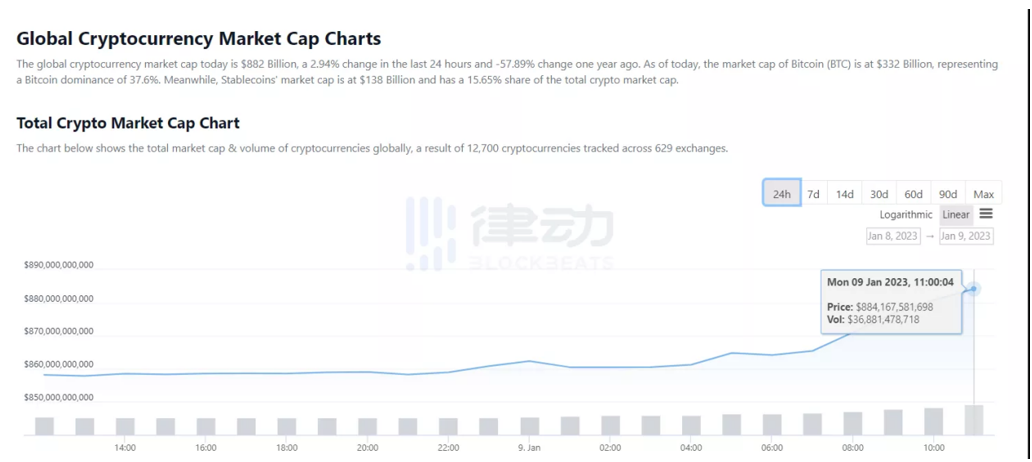 2021年加密货币总体市值曾冲到3万亿。2022年1月9日,据Coingecko数据显示,全网加密货币总市值回升至884,167,581,698美元,24小时涨幅达 2.9%。过去24小时成交量为36,881,478,718美元。