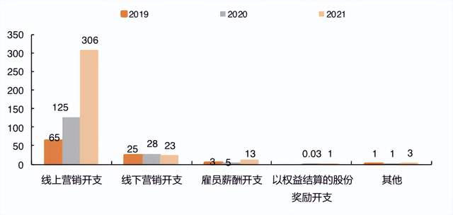 巨子生物也是如此,根据招股书,其线上营销开支主要包括平台营销费、平台服务费及与KOL合作的相关费用,2019-2021年分别为0.65亿元、1.25亿元、3.06亿元,占销售费用比重68.8%、78.7%、88.4%。