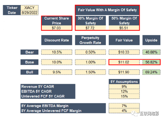 另一种牛市:对于牛市,我将使用类似的假设,除此之外,收入在2022年和2023年将增长15%,并在未来几年保持稳定的10%(我认为很难保持收入增长,但让我们假设小米在智能电动车领域成为行业领导者之一,特别是如果他们瞄准中产阶级,并在2024年拥有充足的电动车充电器,那么是有这种可能性)。