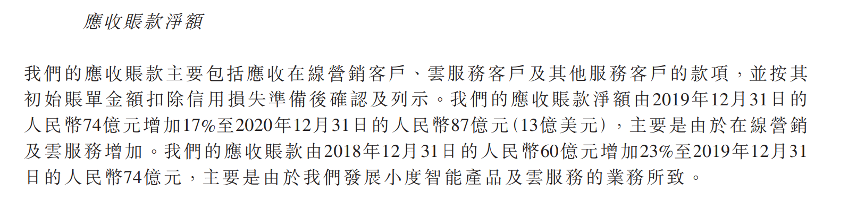 百度回港上市的招股书中提到,应收账款的增加主要是由于发展小度智能产品及云服务所致,鉴于小度智能在百度非在线营销营收中占比不高,那么可能更多来自于智能云服务。